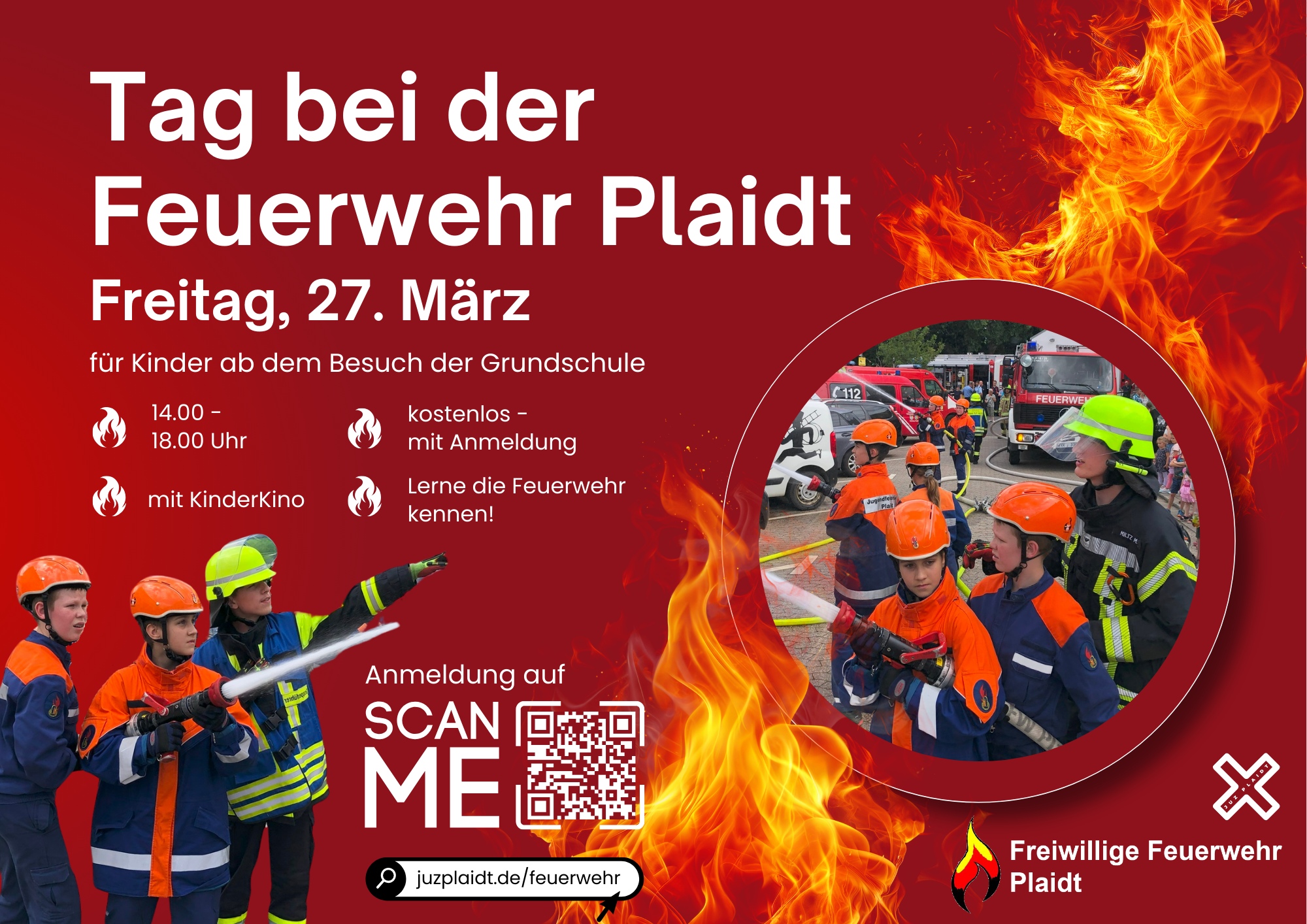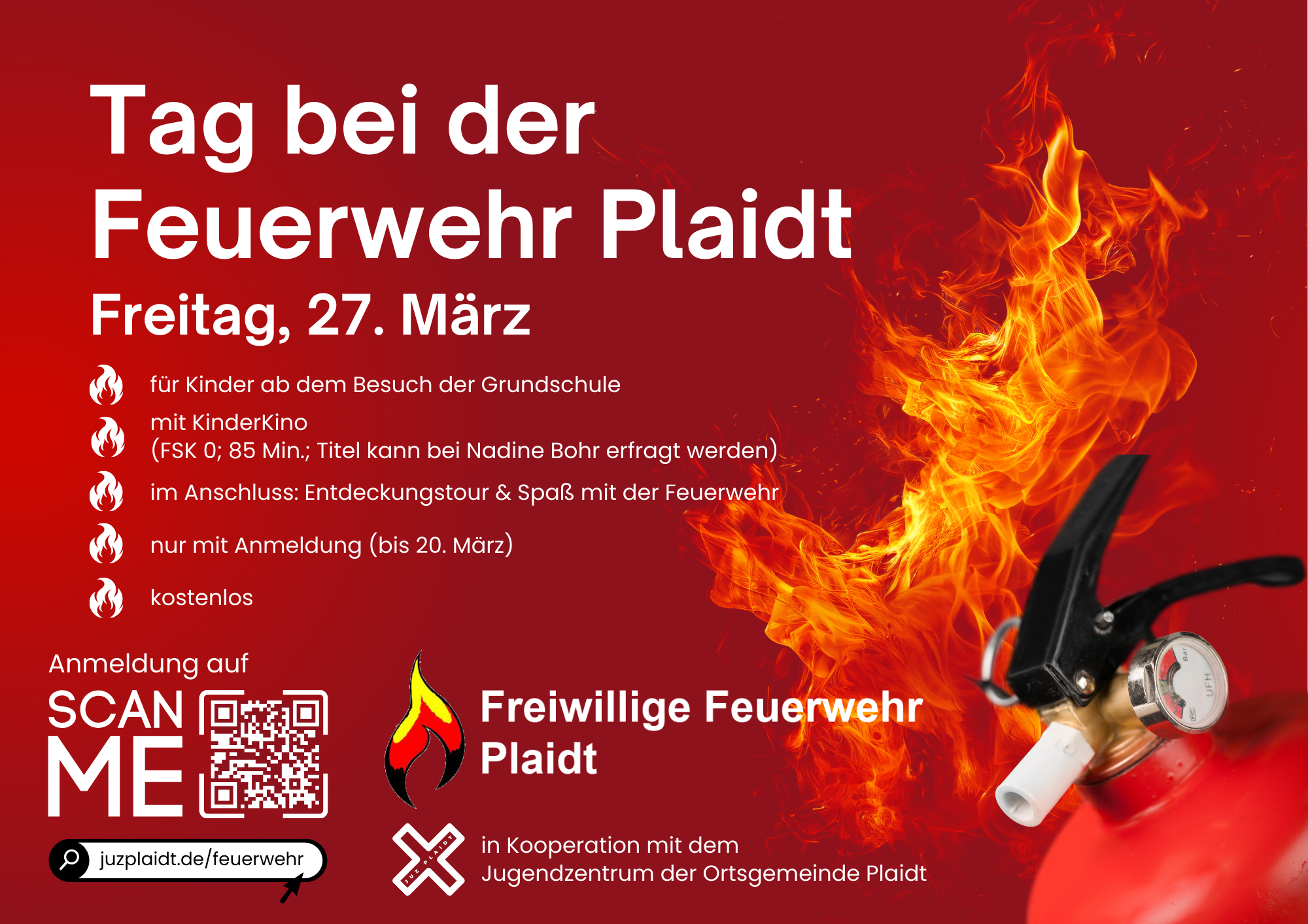 Die Teilnahme an der Veranstaltung ist kostenlos. Eine Anmeldung ist jedoch erforderlich und bis zum 22. März online unter juzplaidt.de/feuerwehr möglich.