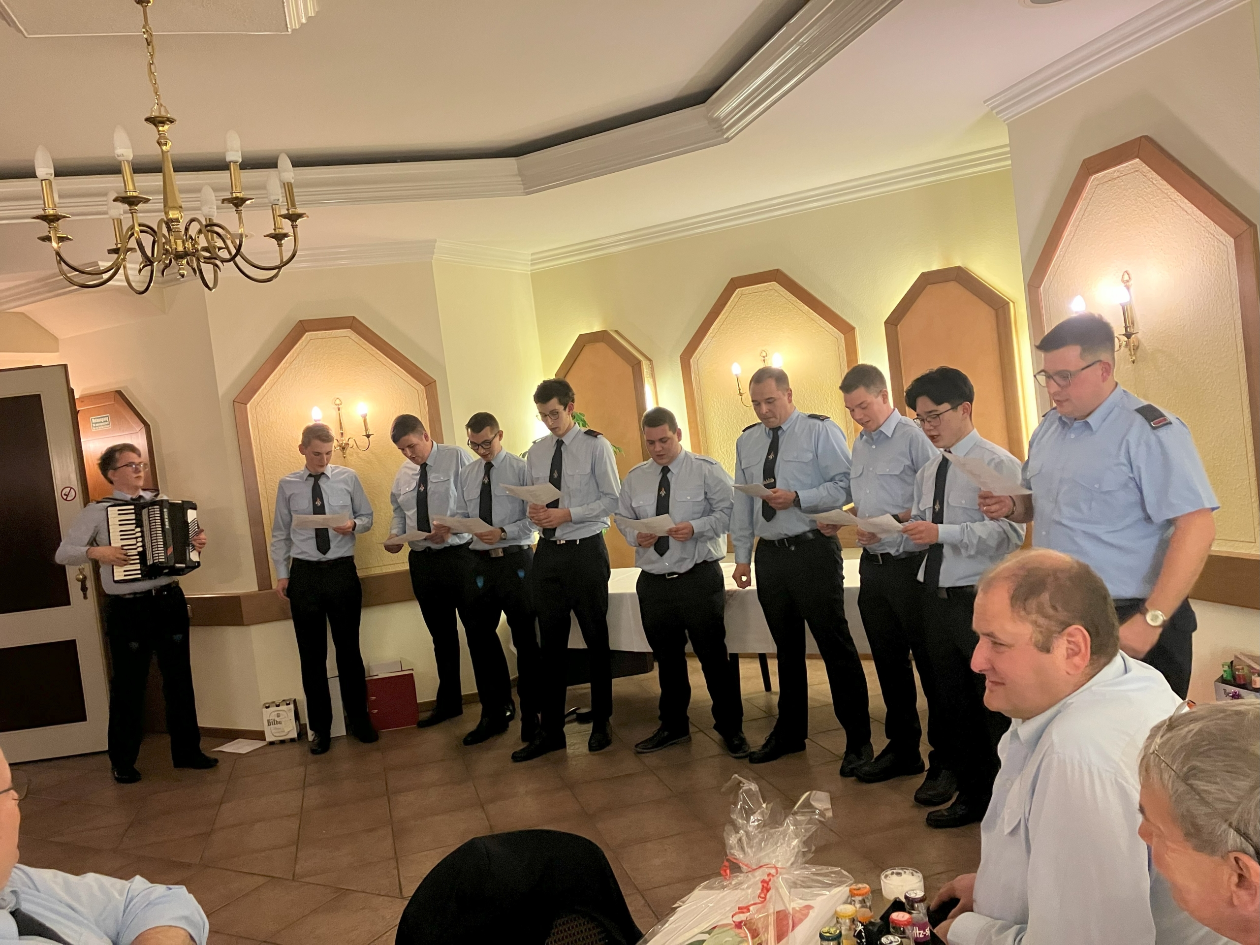 Unter Leitung von Aaron Röder (l.) hatte eine Gruppe Feuerwehrmänner monatelang geprobt. Stimmgewaltig sorgten sie für Stimmung im Saal des Hotels Geromont.